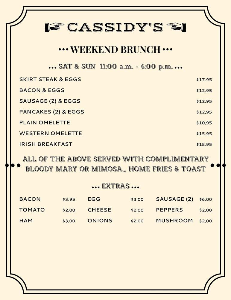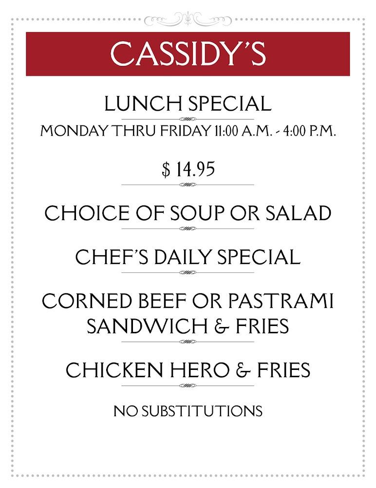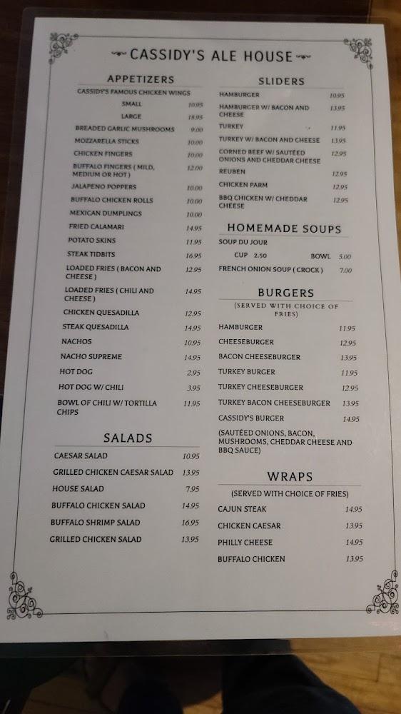Cassidy's menu offers a delightful mix of classic pub fare and unique dishes. Start with appetizers like buffalo shrimp or garlic mushrooms, perfect for sharing. The burger selection includes mouthwatering options, including the popular bacon cheeseburger. Want something hearty? The entrees feature steak tidbits and comforting cottage pie. Don't skip the specials, especially during lunch. Desserts like Bailey's cheesecake cap off meals perfectly. With varied choices and reasonable prices, Cassidy's satisfies cravings for all.